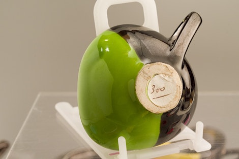 The pieces were formed by slipcast method, dried, signed with a relief stamp and fired at low temperatures. Coloring took place by holding them in different liquid glaze combinations. After 2nd firing, the bases of the cups had to be grinded to obtain some stability. The triangular form of the cups and handles are clear witnesses of the space age and besides that the set brings back sweet memories of Brigitte Bardot & St. Tropez.