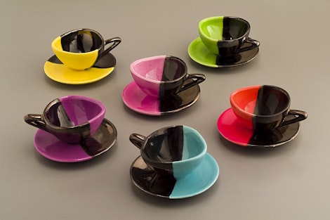 The pieces were formed by slipcast method, dried, signed with a relief stamp and fired at low temperatures. Coloring took place by holding them in different liquid glaze combinations. After 2nd firing, the bases of the cups had to be grinded to obtain some stability. The triangular form of the cups and handles are clear witnesses of the space age and besides that the set brings back sweet memories of Brigitte Bardot & St. Tropez.