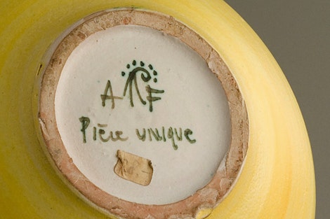 The following sparse information was provided to me by a former pottery associate: André Louis Freymond, born 14.10.1923, worked as a studio potter and painter. Pottery education at the ceramic school of Chavannes-Renens (Lausanne) Switzerland. Worked in Basel and Rheinfelden from 1942, had a pottery studio in Böckten from 1948. First personal exhibition in Lausanne in 1956. Following expositions in: Liestal, Basel, Zurich, Aarau, Sion, Viege, Solothurn, Bern & Rheinfelden. Diploma of honour in Florence, silver medal in Prague. From 1967 on, permanent exposition in Böckten: "El Pueblo". Made study travels to Italy and Spain. His agent was Séquin-Dormann in Zürich (a shop specializing in home decoration and kitchen utensils, closed down in 2009). His pottery was sold by flower shops, or directly from the pottery. He closed the studio in Böckten around 1978. I guess he moved back to Lausanne to retire among the more culture sensitive French/Swiss of that region.