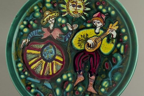 Francis Crociani (1929) decorated this plate in 1951 at the Cerenne workshop (see also the Vallauris section of the website) of Charles René Roger Neveux. In the middle of the plate the Cerenne back stamp is still slightly visible. This atelier was one of the bigger ceramic workshops in Vallauris in the 1950's and employed up to 40 people, of which 15 were decorators. Ce(ramique)ren(é)ne(veux)