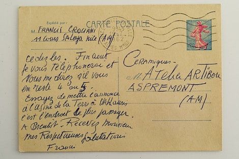 "Sir, I am the potter, who bought the (potter's) wheel, it has been mounted, perfect. I write you concerning the plaster moulds, which I asked you to keep until the end of august. I do not think, I have the possibility to buy them all (from you). Certainly 4 or 5, but not more. So when you find an amateur, leave them (to him). At the end of august I will give you a phone call and you can tell me if 4 or 5 are left. Try to put an ad at the factory De La Terre in Vallauris. This is the place where most people pass by. See you soon, please receive, Sir, my respectful regards, Francis".