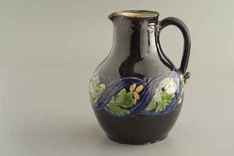Pitcher, decoration oak leaves and acorns, designed by Max Läuger, around 1898, H20cm D15cm, bearing the KTK mark | more samples: [1][2][3] |